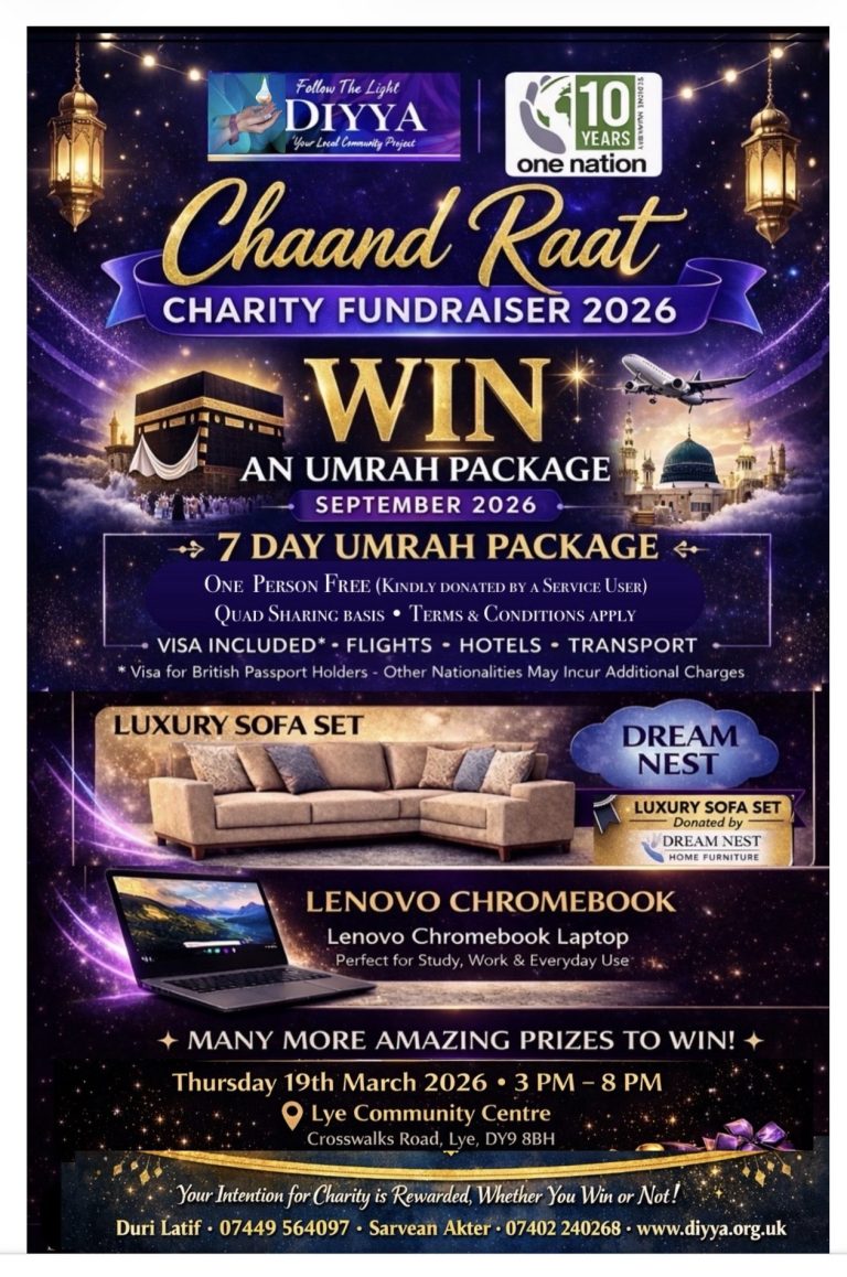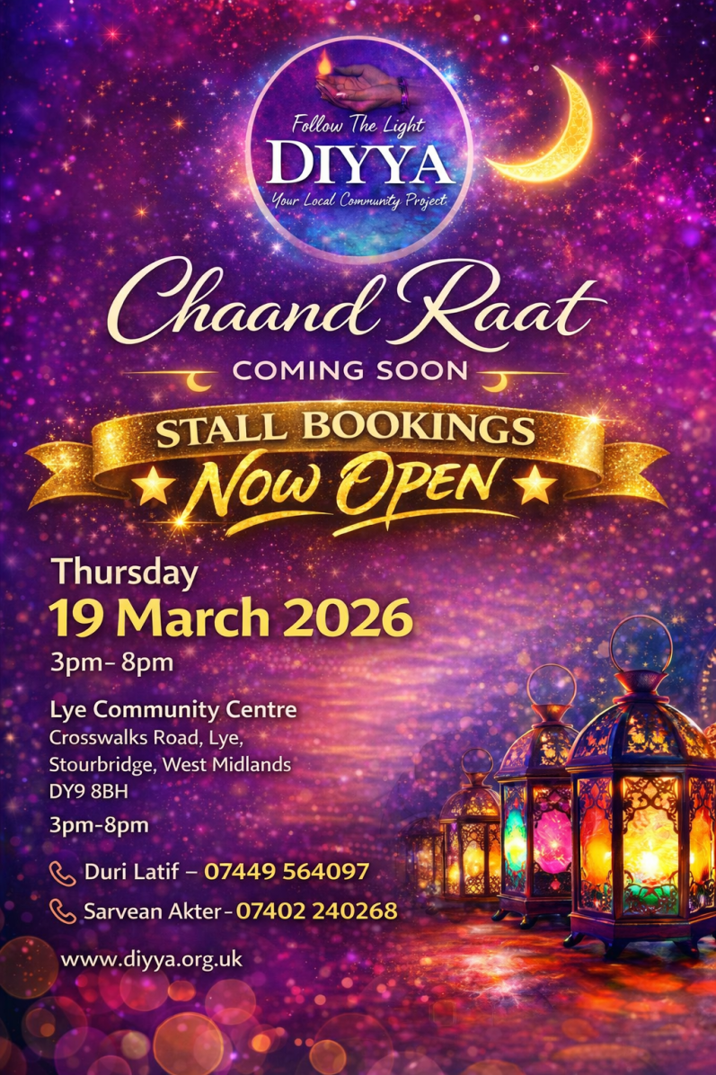 DIYYA Community Project warmly invites you to our Annual Chaand Raat Charity Fundraiser, a special evening bringing the community together to celebrate the blessed nights of Ramadan while supporting charitable causes. 🤍